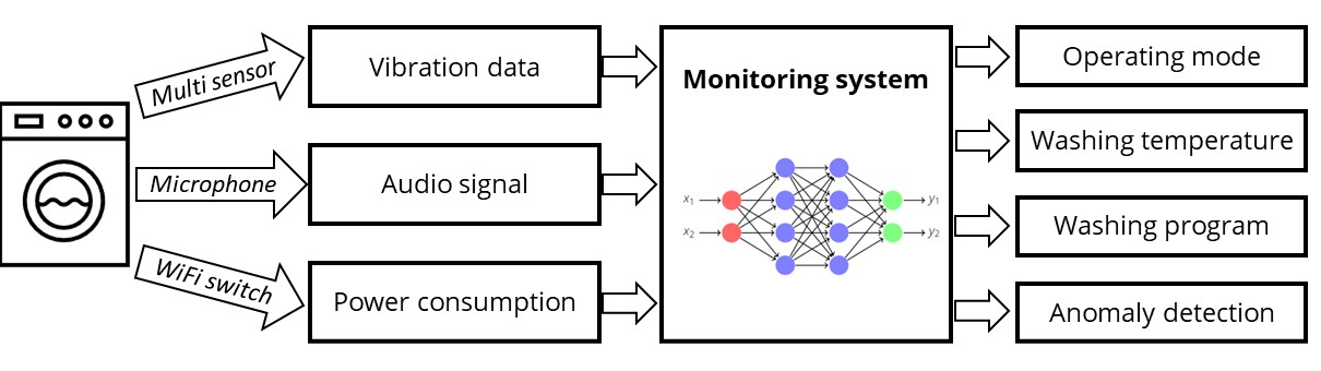 Christoph Wilding: Das Setup setzte sich aus einer handelsüblichen Waschmaschine zusammen, die mit einem Strommessgerät des Herstellers myStrom für die Messung der Leistungsaufnahme sowie mit einem Multisensor von Bosch, dem Bosch Connected Industrial Sensor Solution (Bosch CISS, Beschleunigungssensor, Gyroskop, Magnetometer, Temperatursensor) oder von Sensry, dem Sensry Kallisto (Beschleunigungssensor, Gyroskop, Magnetometer) ausgestattet wurden. Die Sensoren wurden jeweils an der Frontseite der Waschmaschine unter der Tür installiert, um nicht invasiv in die Maschine eingreifen zu müssen. Zur Audioaufzeichnung wurden die in den Android Notebooks, Smartphones oder Tablet-PCs integrierten Mikrofone genutzt, auf denen auch die Messanwendung (grafische Oberfläche) zur Eingabe der Metadaten des Waschvorgangs (Waschprogramm, Temperatur, Optionen) lief.