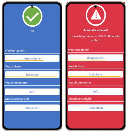 Christoph Wilding: Beeinflusst wird das Monitoringsystem durch Vibration, Audiosignal, Stromverbrauch und Prozesszeit. Vibration ist die in der Praxis häufig verwendete Größe zur Bestimmung des Betriebsmodus und Maschinenzustands. Die unterschiedlichen Schwingungen ermöglichen es Rückschlüsse auf die Maschinenaktivität abzuleiten. Das Audiosignal dient der Bestimmung des Betriebsmodus und erweist sich als besonders effektiv bei der Erkennung von Anomalien in Verbindung mit maschinellem Lernen. Der Stromverbrauch der Waschmaschine wird durch die Temperatur und den gewählten Waschgang beeinflusst. Die Momentanleistung gibt hier gut Rückschlüsse auf die Aktivität des Heizelements und der Verlauf des Stromverbrauchs auf das genutzte Waschprogramm. Die Prozesszeit bzw. die Ablaufzeit der verschiedenen Waschprogramme unterscheiden sich aufgrund der Länge der Reinigungsphase deutlich voneinander, was die Erkennung des Waschprogramms erleichtert.