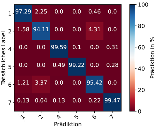 Christoph Wilding: Für die Bewertung der Güte wurde der sogenannte F1-Score herangezogen, der die Bewertungsmetriken Precision (Rate der Fehlalarme) und Recall (Rate der richtig erkannten Anomalien) zu einer Gesamtgenauigkeit kombiniert. Mit dem Lernalgorithmus Support Vector Machine (SVM) konnte die Maschinenaktivität unter Berücksichtigung der Gesamtdaten mit einer Genauigkeit von 98 % ermittelt werden. Für die Teilmengendaten Vibration (83 %) und Audiosignal (97 %) mittels SVM sowie für Stromverbrauch (90 %) mittels Entscheidungsbaum (CART) wurden dabei die höchsten F1-Scores erreicht. Wie diese Ergebnisse anschaulich visualisiert werden, soll exemplarisch die untere Konfusionsmatrix basierend auf den kombinierten Sensordaten für CART zeigen.