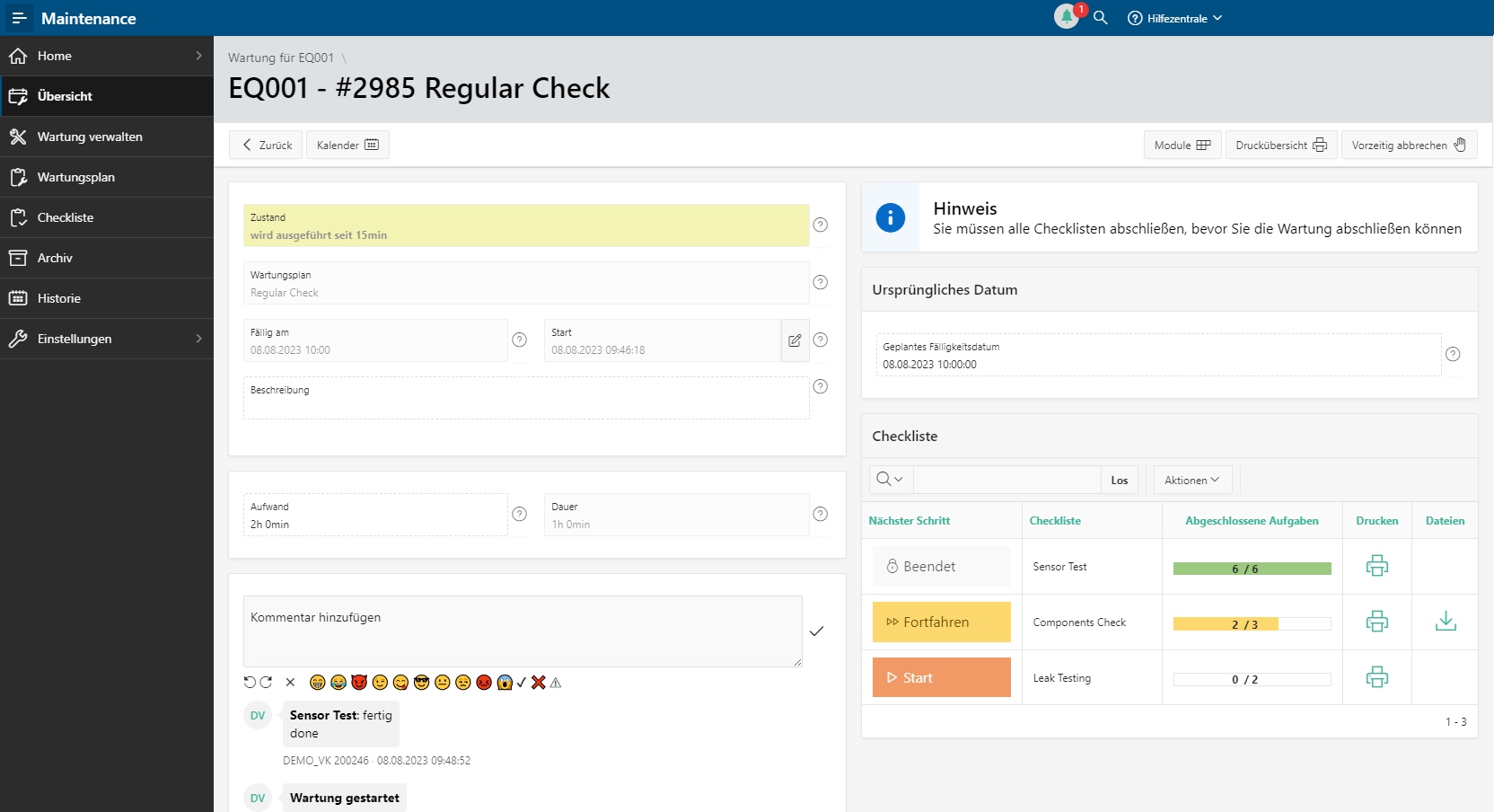 Die Wartung kann jetzt mit optimierten Checklisten durchgeführt werden. Unsere neue Fortschrittsanzeige zeigt dem Bediener genau an, wo er sich bei der Abarbeitung befindet.
