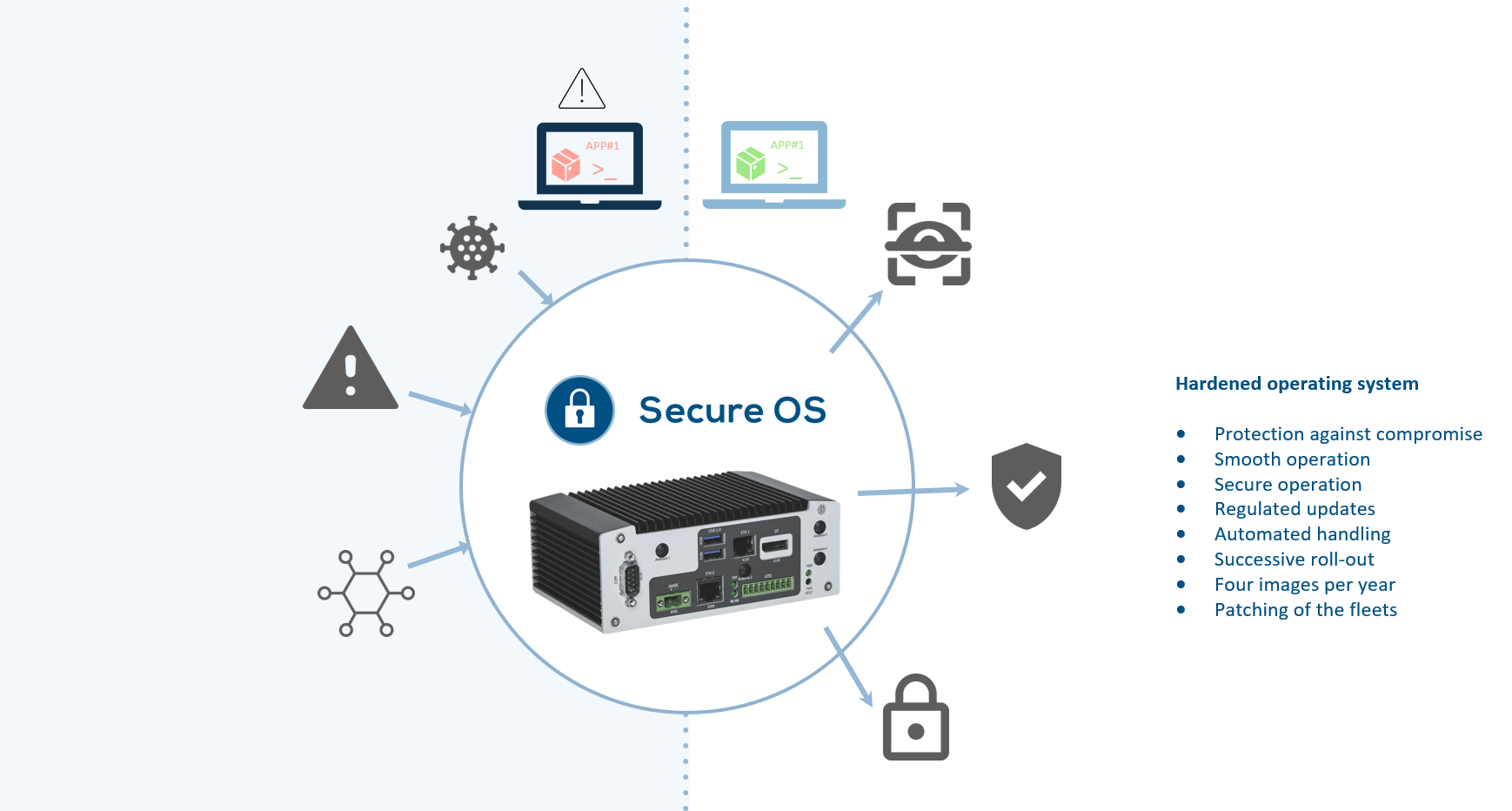 For IoT devices to function smoothly, the firmware or operating system must be permanently kept up to date. Installed software always offers a certain gateway for hacker attacks. If there is insufficient bandwidth for regular updates, this creates additional uncertainty for IT managers, as 100% uptime cannot be guaranteed. To prevent this, it makes sense to reduce the operating system to its core functions, to completely deactivate unnecessary system functions, and set security functions so that no automatic updates are permitted at all. In this way, a secure or hardened operating system can be created, which is protected as much as possible against security gaps, while still allowing data transmission. In the event of critical vulnerabilities, the hardened operating system for X86 or ARM, based on Yocto Linux with full integration of device drivers, provides short-term updates, as it can draw on two redundant operating system partitions. In addition, it is suitable for placing the application on the operating system partition of a large number of devices with the same or a simple application and delivering both in one package. Since one to four update cycles per year are sufficient for such devices, this procedure is particularly suitable. Managing the application using containers, on the other hand, would be more than is necessary for this.