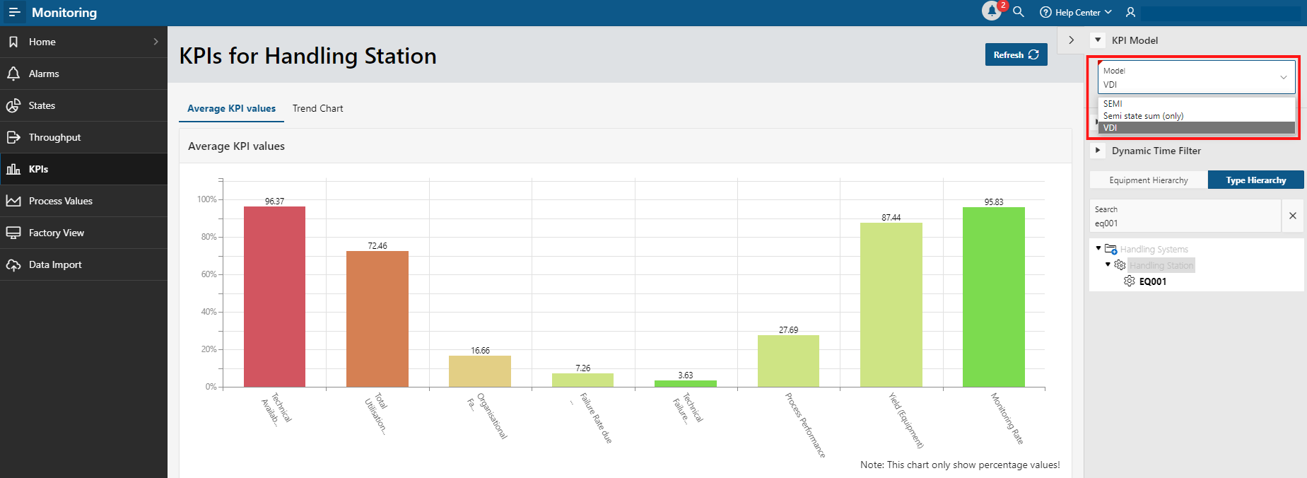 A practical drop-down menu in the KPI view allows the user to quickly switch between KPI models to open the possibility of comparing machines across multiple locations.
