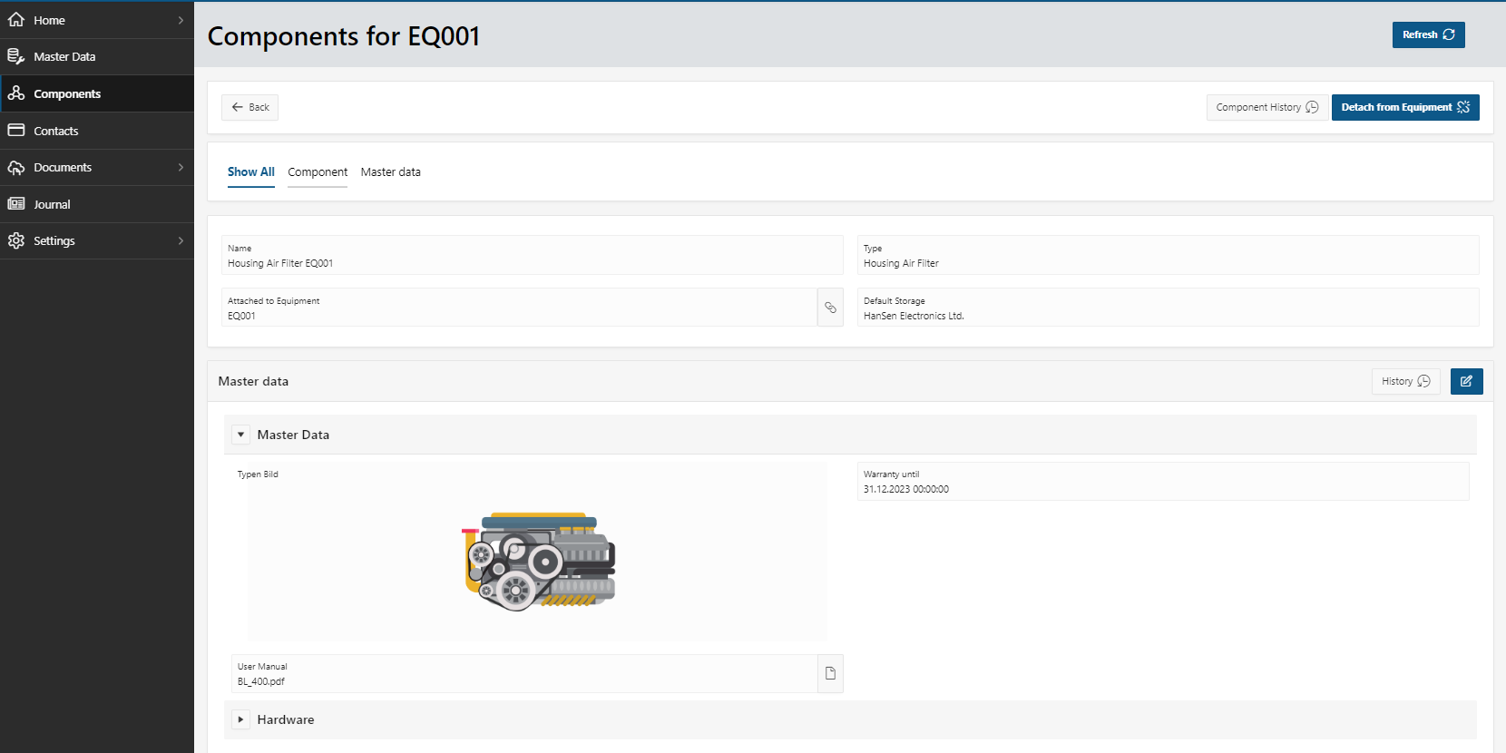 Components can be categorized by type to reduce the administration and maintenance work of similar components to a minimum. Master data groups are predefined and default values are automatically adopted for manufacturer type, specifications and documents.